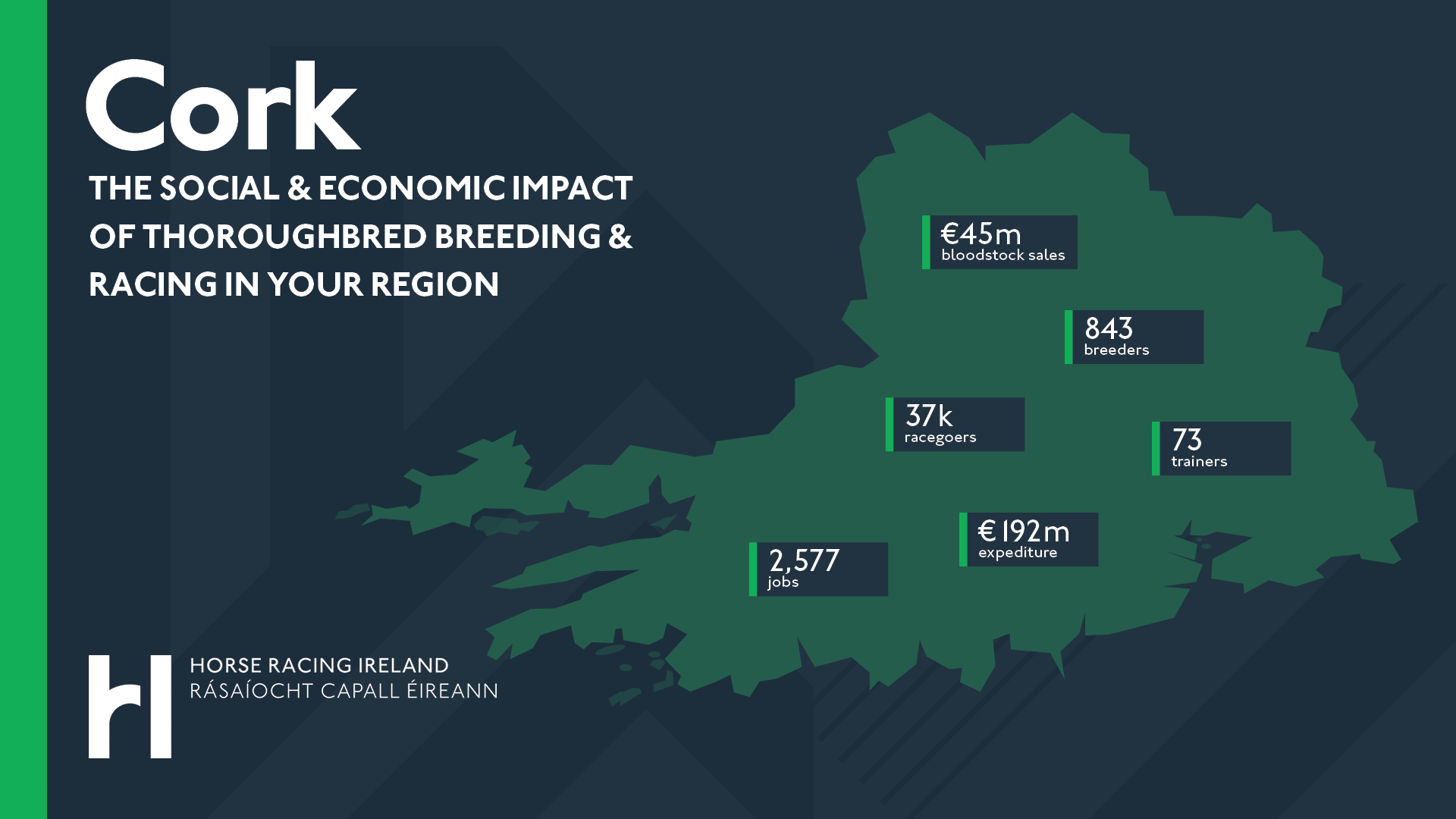 This section provides a specific overview of the significant contribution of horse racing to County Cork, where the industry generates €192 million in expenditure and provides 2,577 jobs. The county is home to the country’s largest proportion of breeders, 843 being 13% of the overall total, and 73 trainers. Bloodstock sales generated in the county amounted to €45 million and it is renowned for the production of top-class horses for both Flat and National Hunt racing.