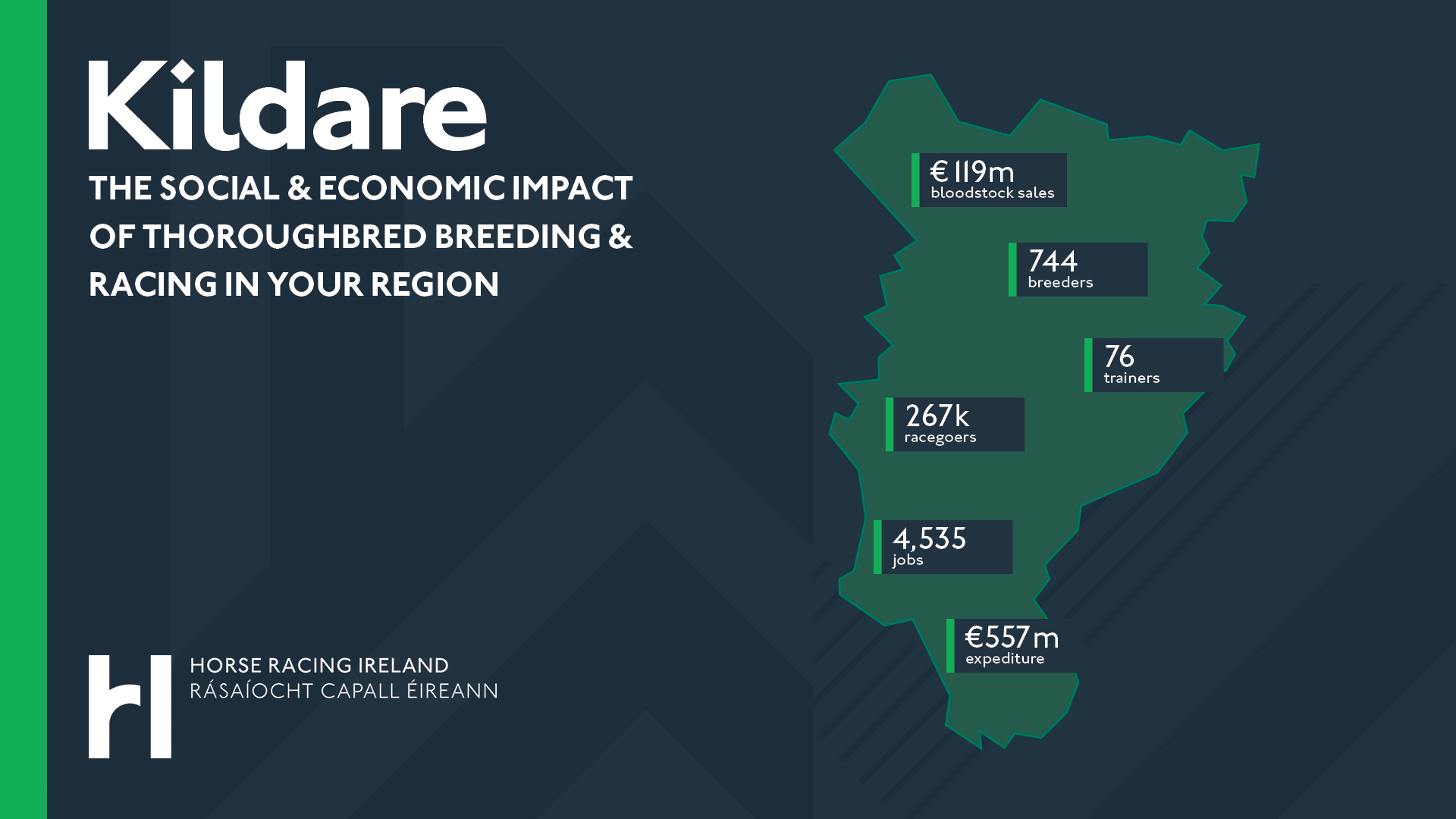 This section provides a specific overview of the significant contribution of horse racing to County Kildare, where the industry generates €557 million in expenditure and provides 4,535 jobs. Known as ‘The Thoroughbred County’, Kildare is home to the headquarters of Irish Flat racing at The Curragh – where all five Irish Classics are run - as well as Punchestown and Naas racecourses. The Curragh training grounds offer 80 miles of gallops where over 50 trainers train approximately 1,000 horses. The Irish National Stud in Kildare town is a world-famous tourist attraction and welcomed 150,000 visitors in 2023. There are 744 breeders and 76 trainers based in the county, and bloodstock sales of €119 million.