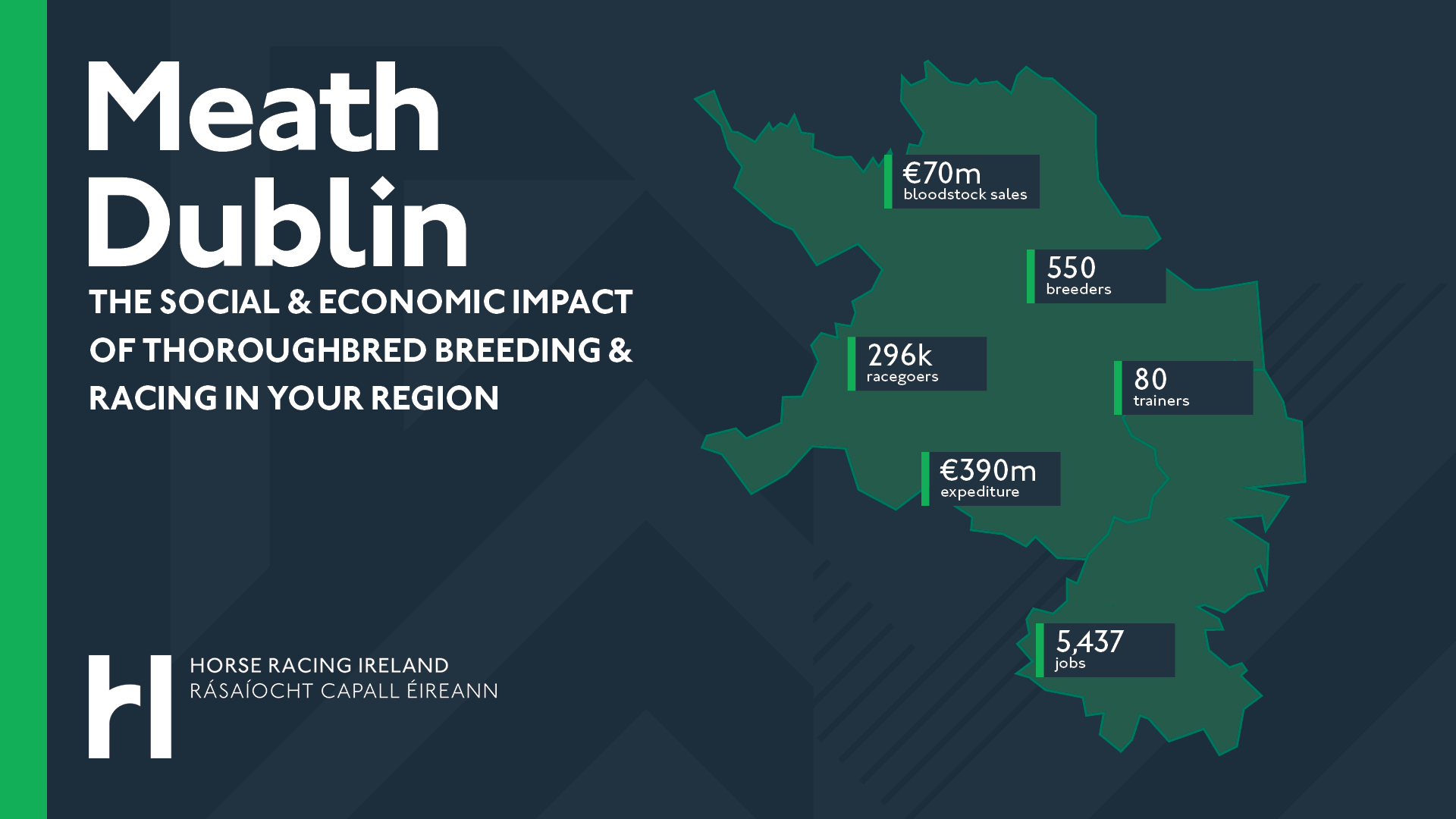 This section provides a specific overview of the significant contribution of horse racing to the counties of Meath and Dublin, where the industry generates €390 million in expenditure and provides 5,437 jobs. The region contains five racecourses – Fairyhouse, Navan, Bellewstown, Laytown and Leopardstown - which were attended by 296,000 racegoers in 2023, and is home to some of Ireland’s most popular racing festivals including Dublin Racing Festival and Fairyhouse Easter Festival featuring the BoyleSports Irish Grand National. There are large numbers of breeders and trainers based in the region with 550 breeders and 80 trainers between the two counties.