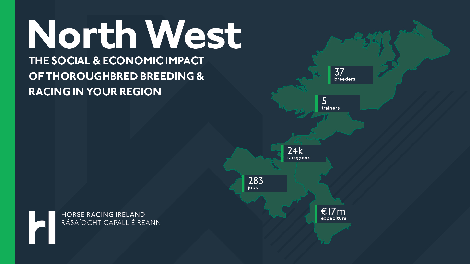 This section provides a specific overview of the significant contribution of horse racing to the Counties of Sligo, Leitrim and Donegal, where the industry generates €17 million. 24,000 racegoers attended the popular Sligo racecourse in 2023. The region is also home to 37 breeders and 5 trainers.