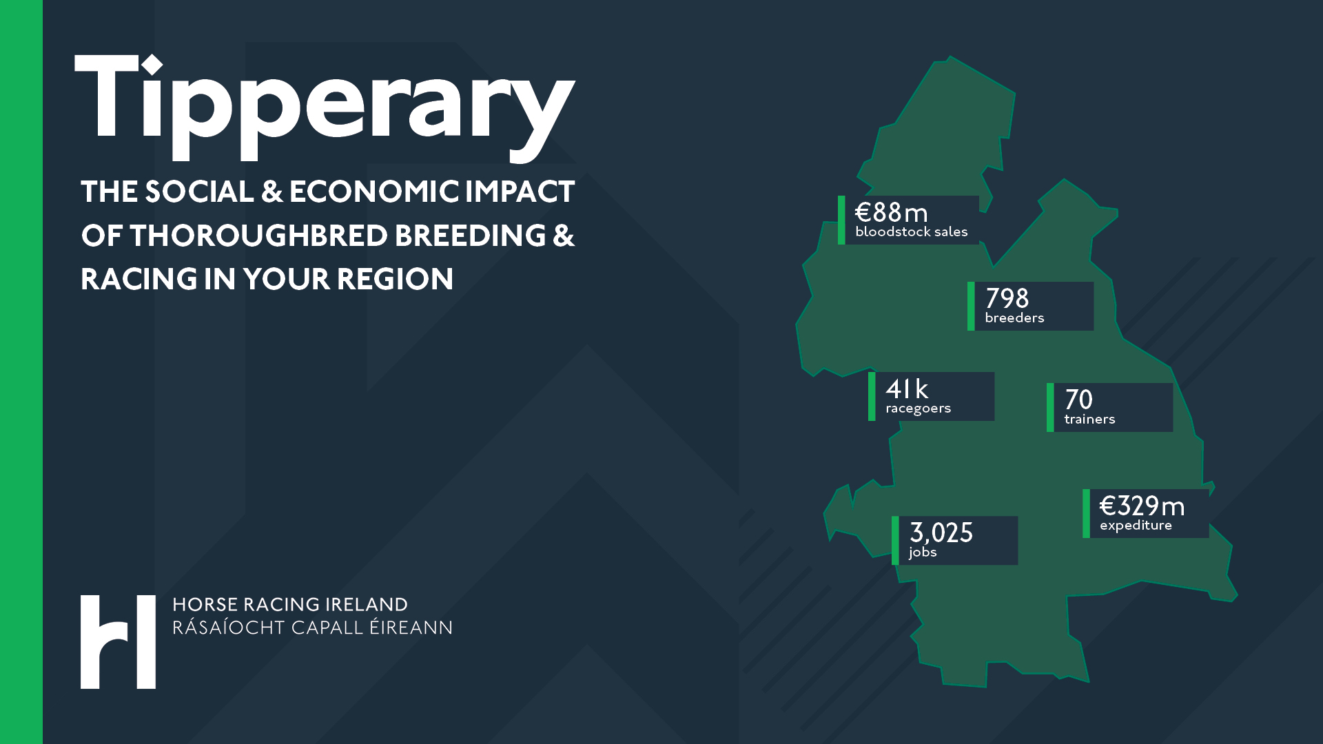 This section provides a specific overview of the significant contribution of horse racing to County Tipperary, where the industry generates €329 million in expenditure and provides 3,025 jobs. The county is home to 798 breeders and 70 trainers, including some of the largest and most iconic studs and training establishments in Europe and three popular racecourses at Clonmel, Thurles and Tipperary, which were attended by 41,000 racegoers in 2023.
