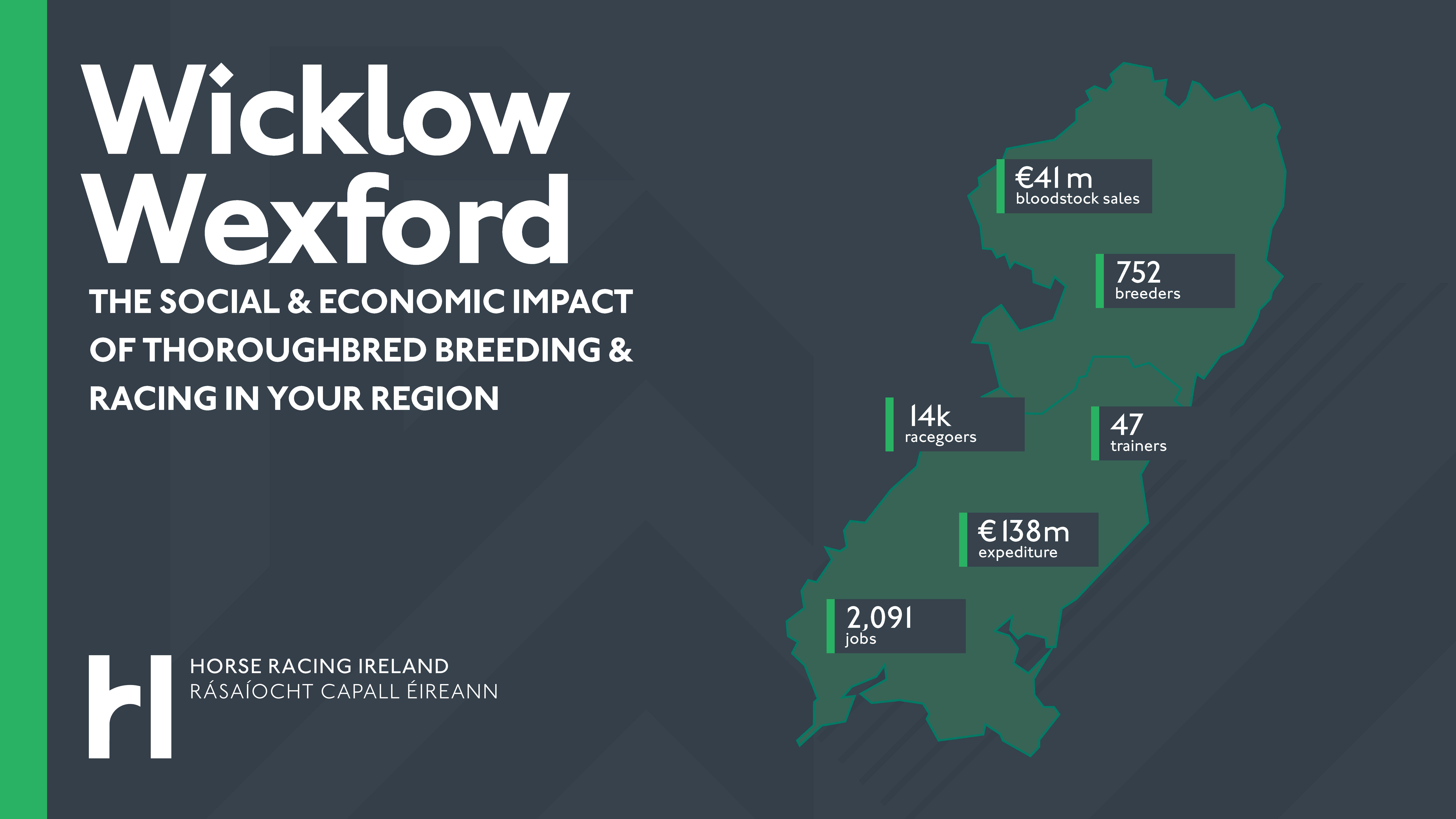 This section provides a specific overview of the significant contribution of horse racing to the Counties of Wicklow and Wexford, where the industry generates €138 million in expenditure and provides 2,091 jobs. The region is home to 752 breeders and 47 trainers and has become a centre of excellence for producing some of the best young point-to-pointers. The region also generated €41 million in bloodstock sales.